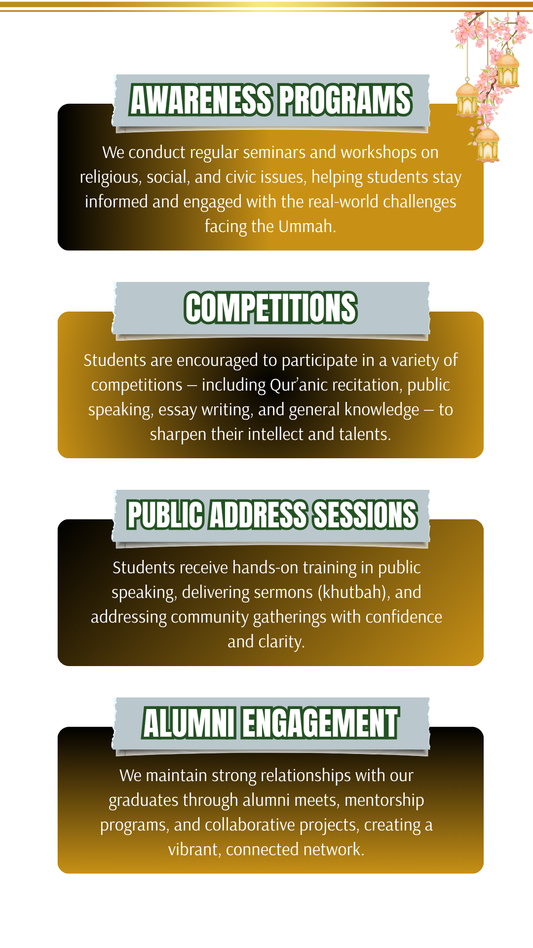 Specially designed camps provide immersive learning experiences in Islamic scholarship, leadership training, communication skills, and personal development.